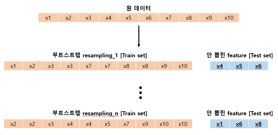 Bagging을 할 때, 부트스트랩으로 원 데이터 안에서 여러 하위 데이터들을 뽑아 낸다고 했습니다. 평균적으로, 각 부트스트랩 트리는 복원 추출이기 때문에 원 데이터의 2/3 정도를 사용합니다. 복원 추출에서 뽑히지 않은 나머지 1/3을 Out-of-Bag(OOB) 관측치라고 합니다.